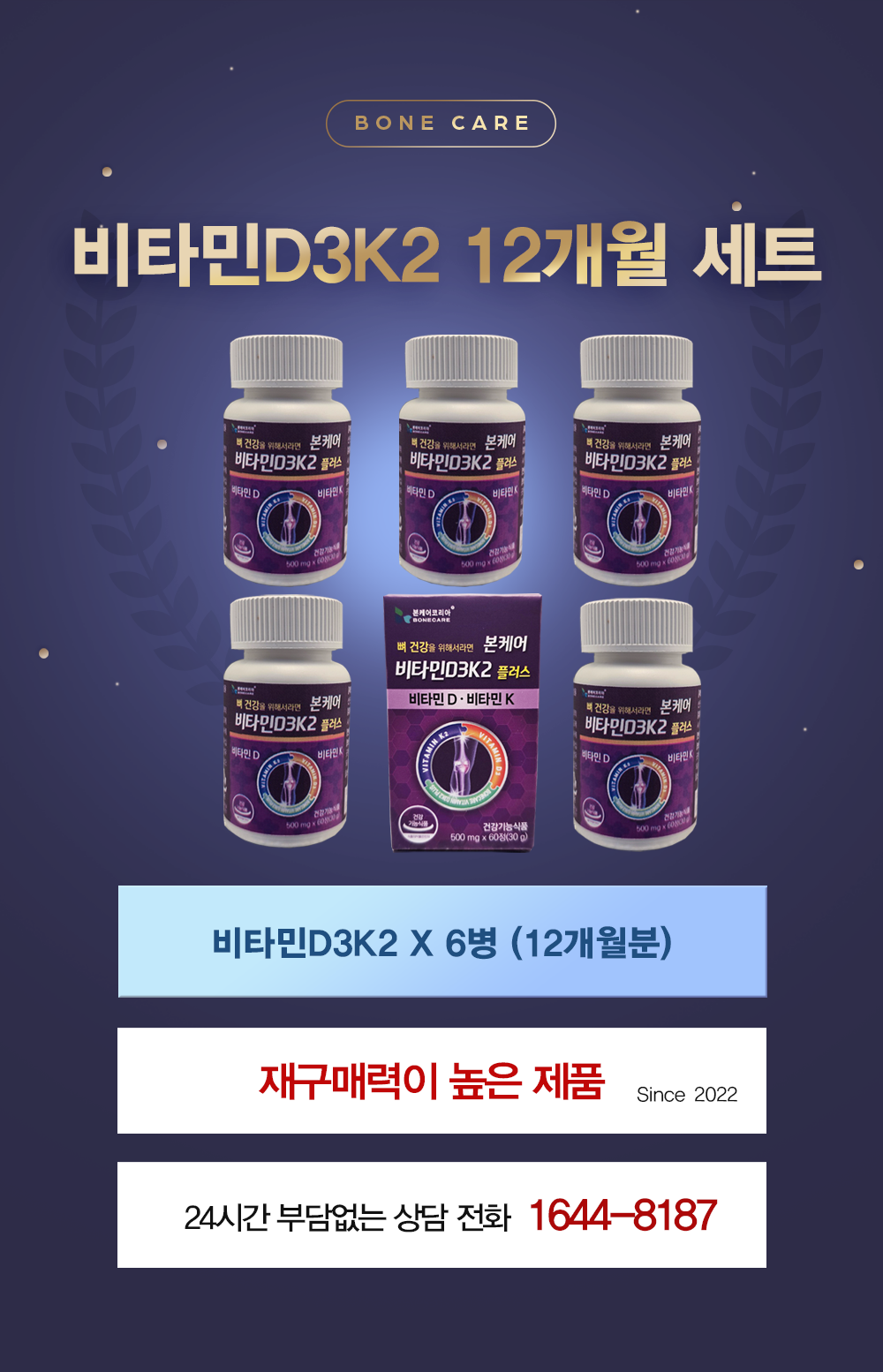 제품명 본케어 발효 비타민D3K2 플러스 메나퀴논 K2MK7 X 60정 6병 (12개월분)